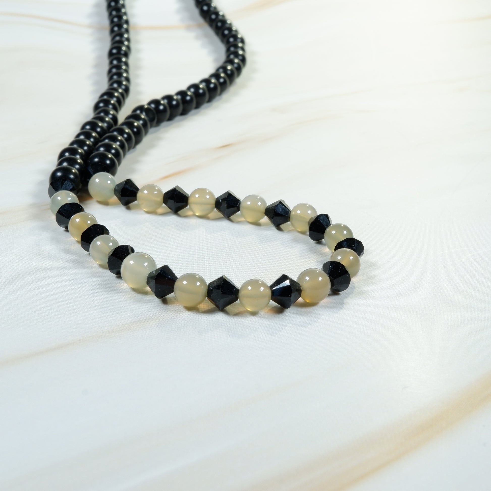 This simple and elegant necklace features black Onyx, grey Moonstone, and Jet Black Crystals. It's the perfect accessory for a night out and would look beautiful with a little black dress