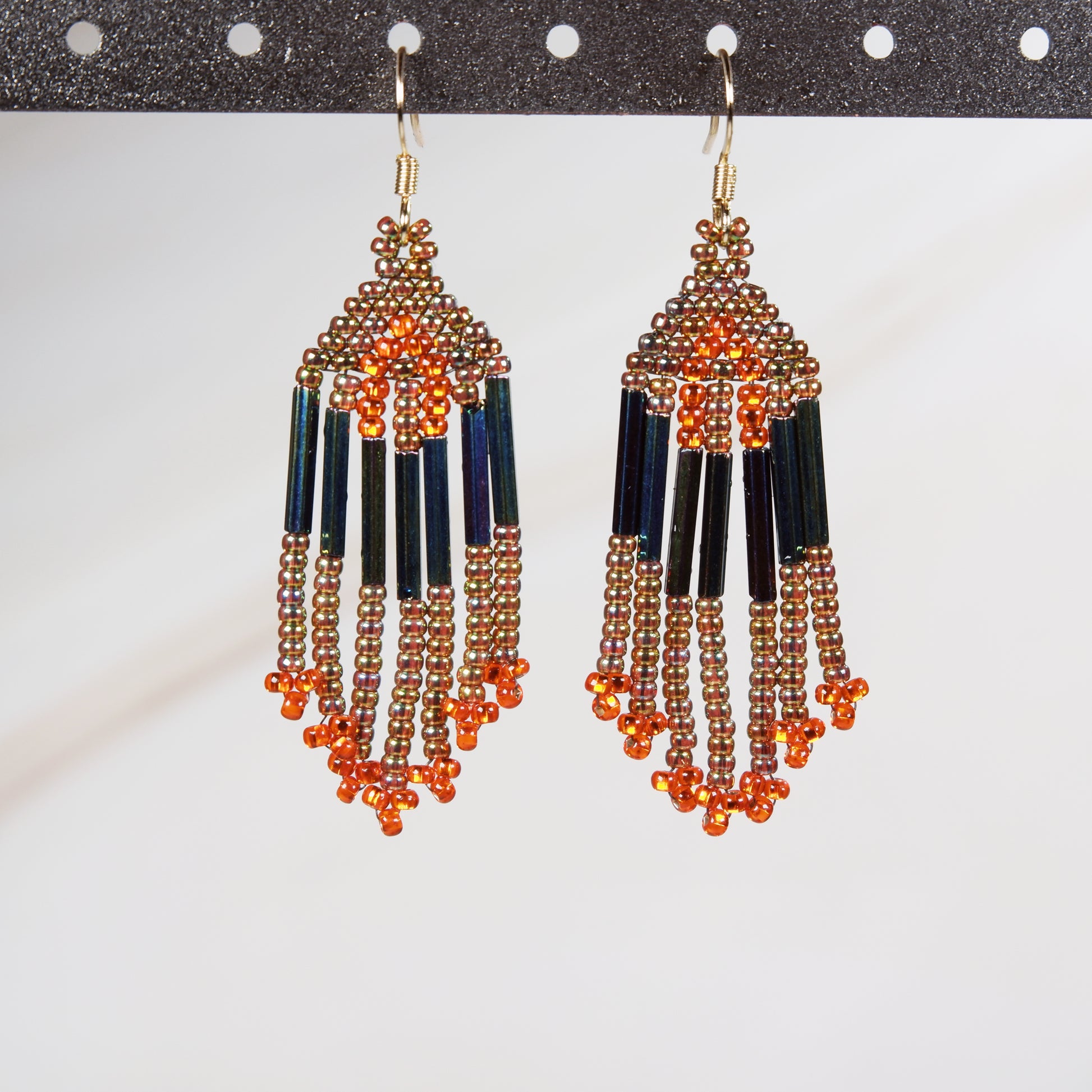 WOW! These are definitely a pair of earrings for someone who wants to make a statement! I love the contrast between the green and orange, but also the iridescence has hints of orange as well. It also features a lovely dark iridescent green bugle bead in the fringe that adds some extra sparkle.