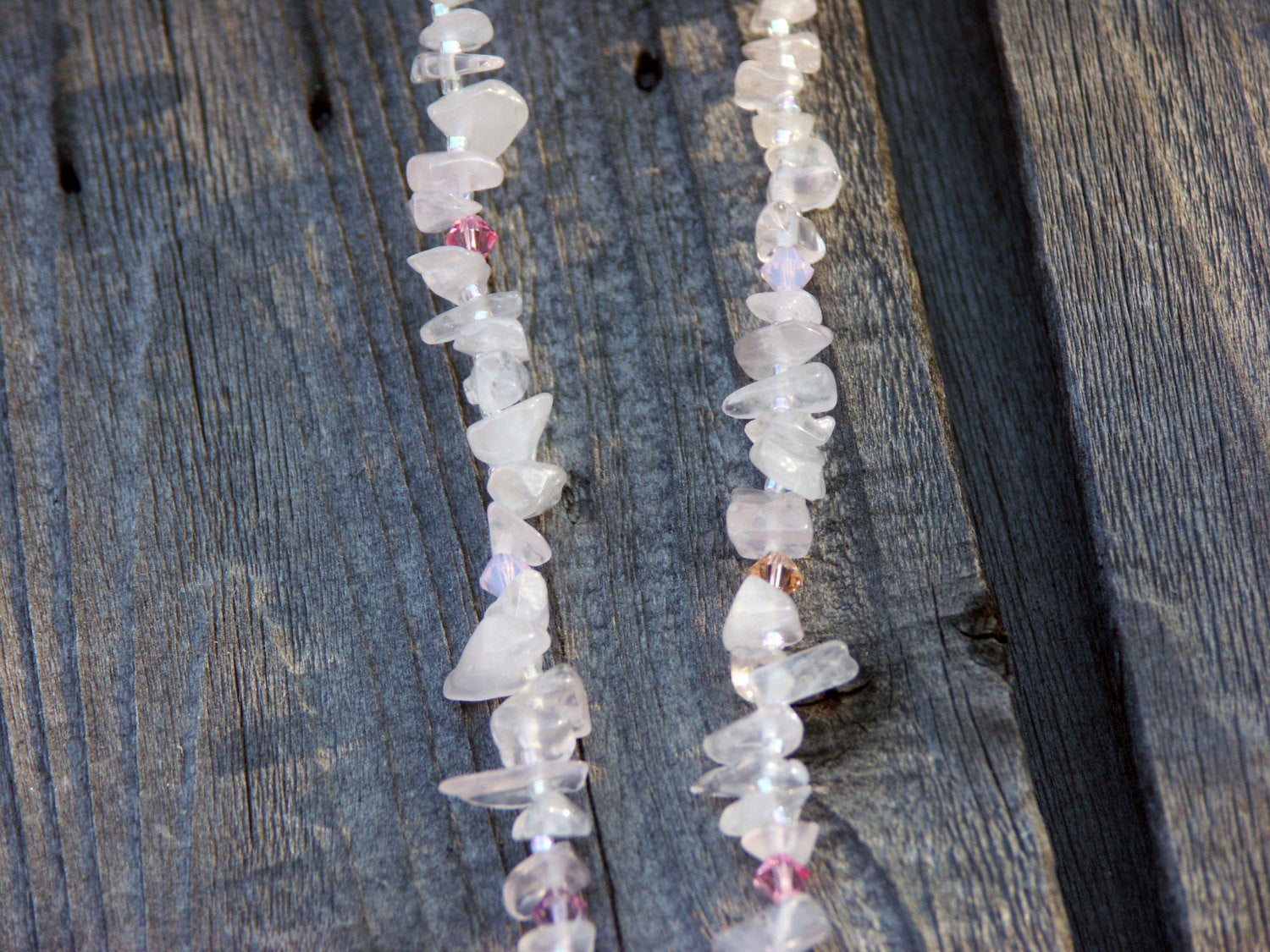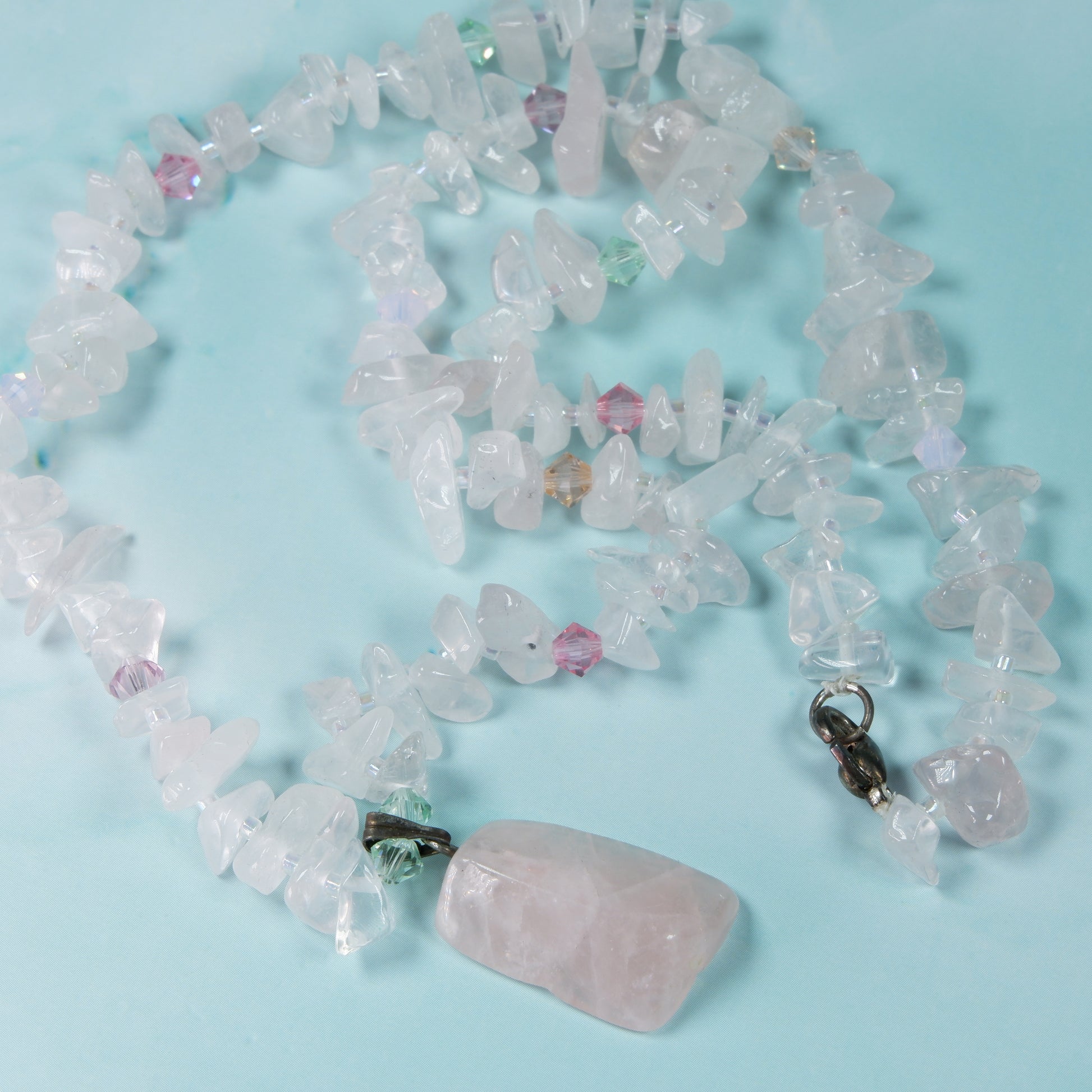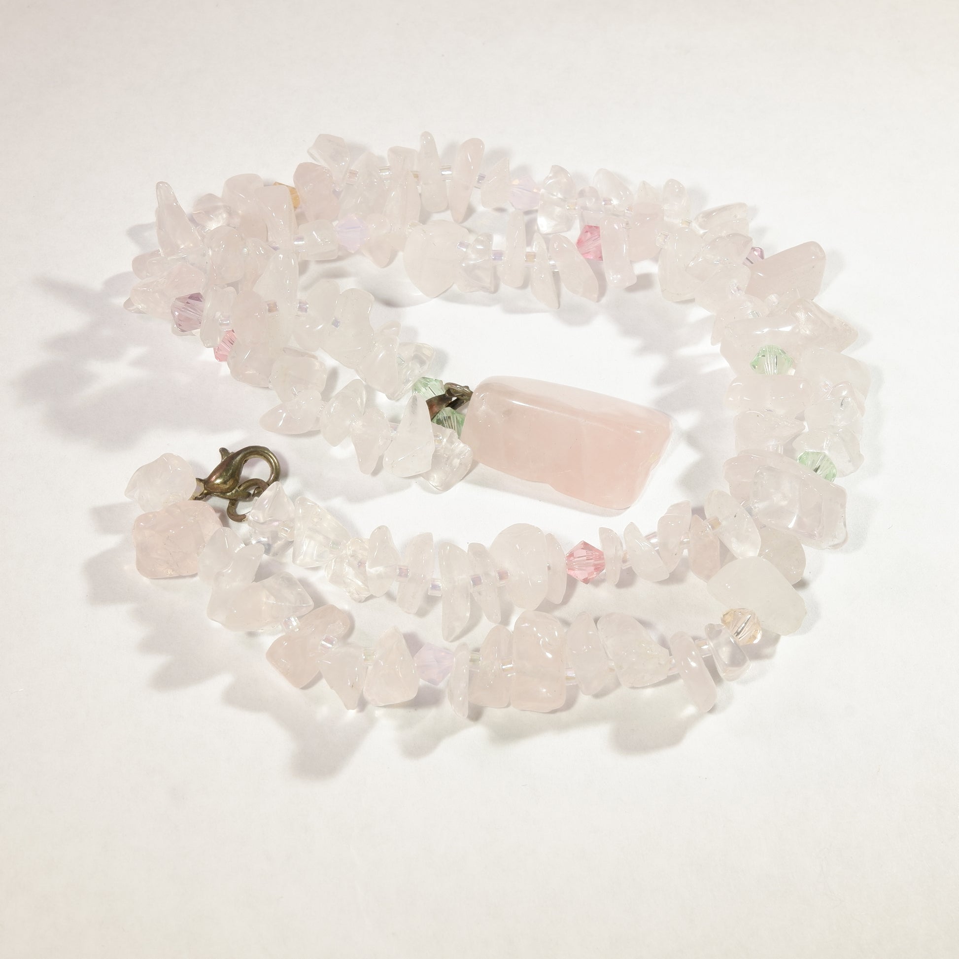 Welcome spring-time with this soft pastel necklace featuring Rose Quartz chips, a Polished Rose Quartz focal, accented with different colored Crystals for a subtle sparkle. The necklace is about 18inches long and can be made longer upon request via an extender chain. The necklace is strung through three times with 4lb test Fireline Thread to ensure maximum durability.