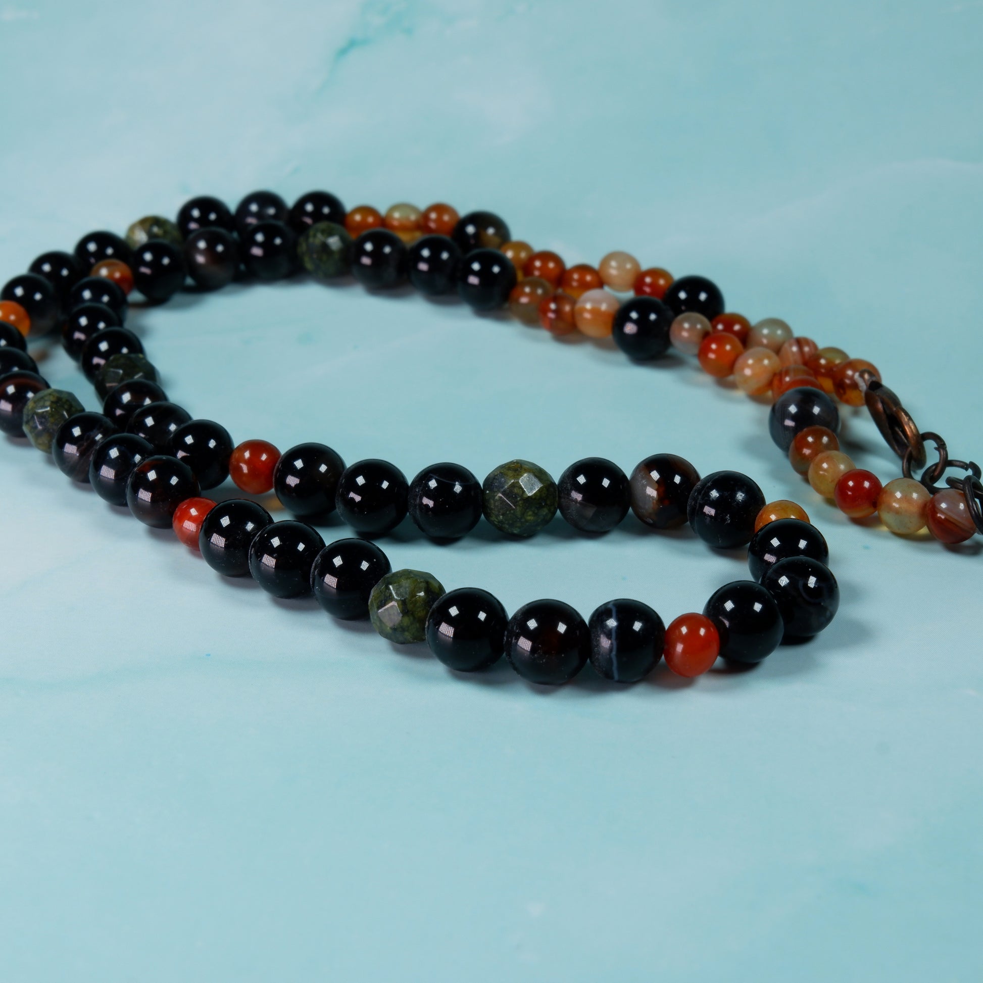 This necklace features a length of Black Agate studded with Orange Agate and Green Serpentine. Each stone is unique and beautiful. The green, orange, and black lend to a beautiful contrast.