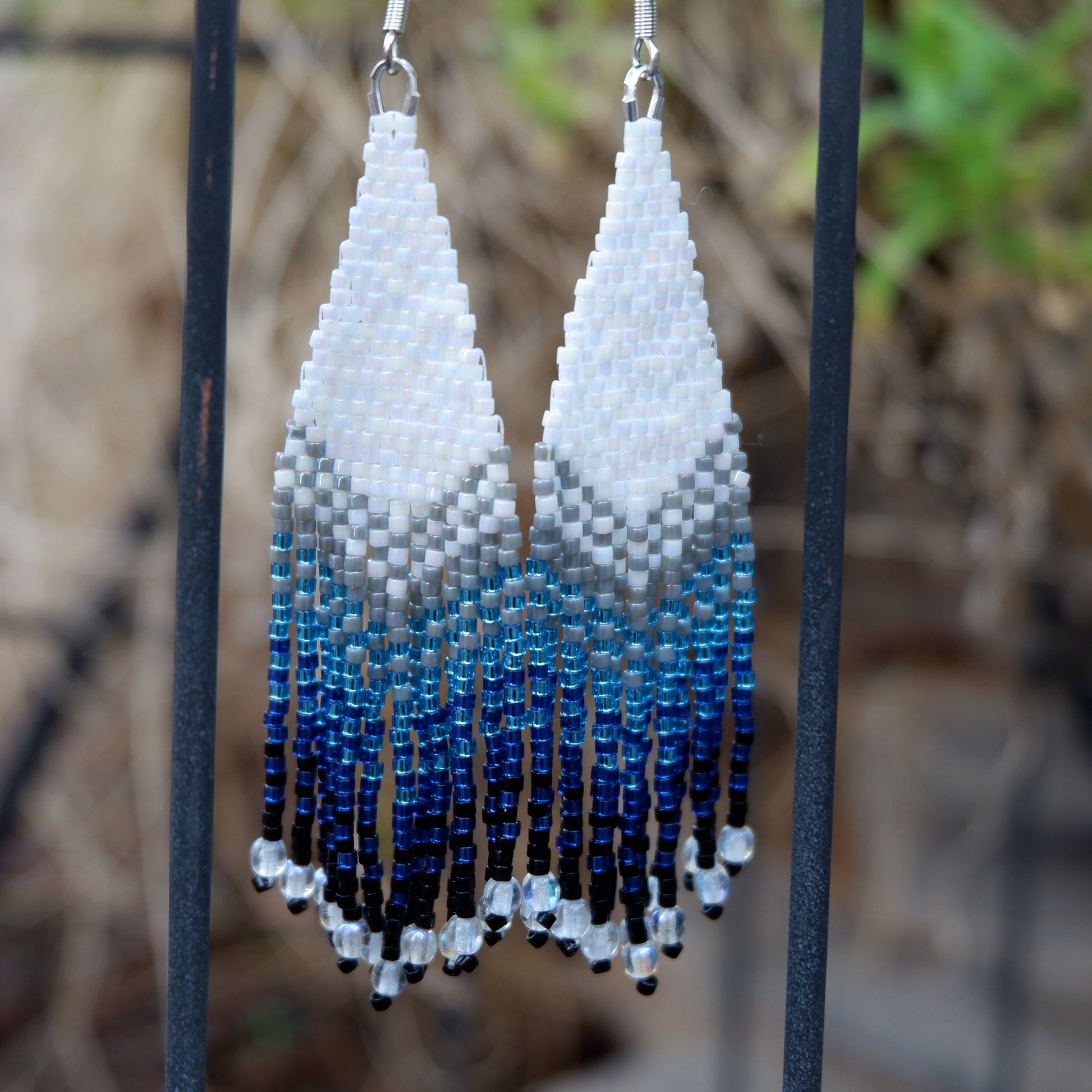 I was inspired to make these during a really intense monsoon storm! These colors were what I was feeling at the time and I love how they all blend together. The glass beads at the bottom are iridescent and remind me of little rain drops~ The white and grey also have a "Rainbow" effect to them. They are about 3.5 in long and very lightweight.